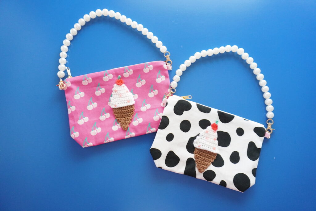 オンラインショップにパーツ付きBAGが2種UPされました。持ち手は取り外し可能です。手編みのアイスワッペンがSuper可愛いですよ♡