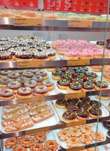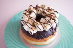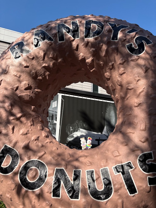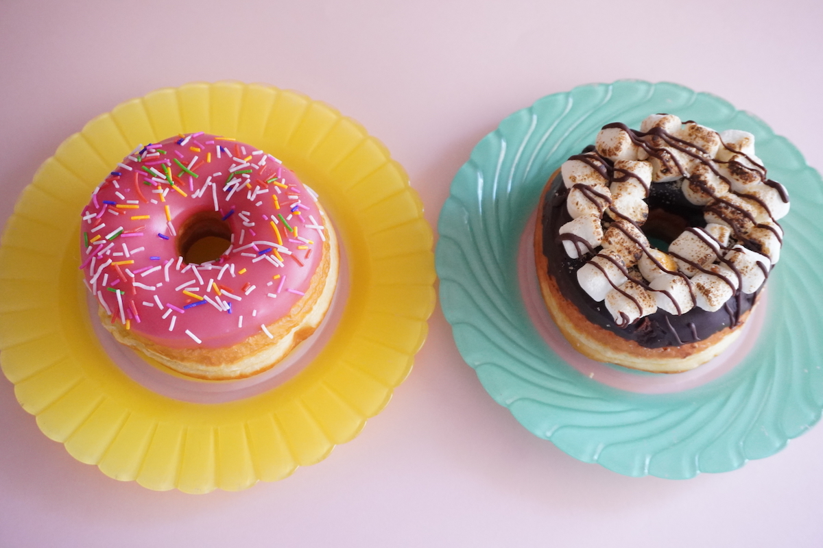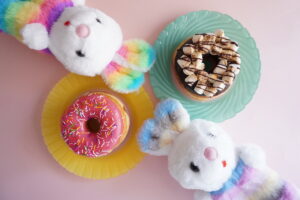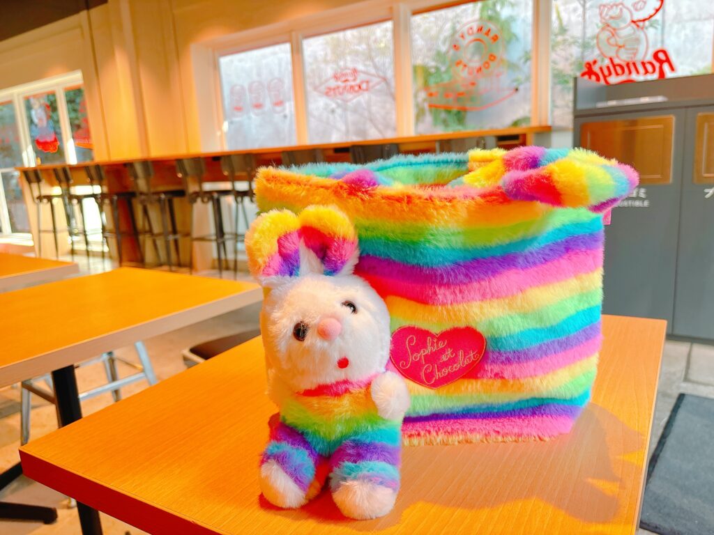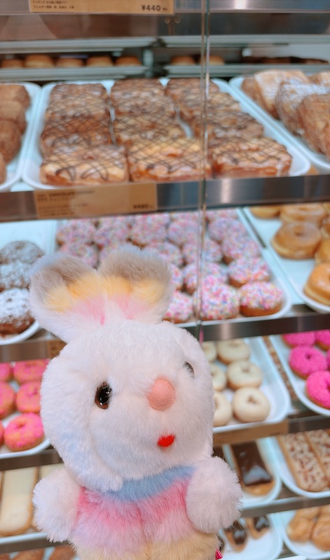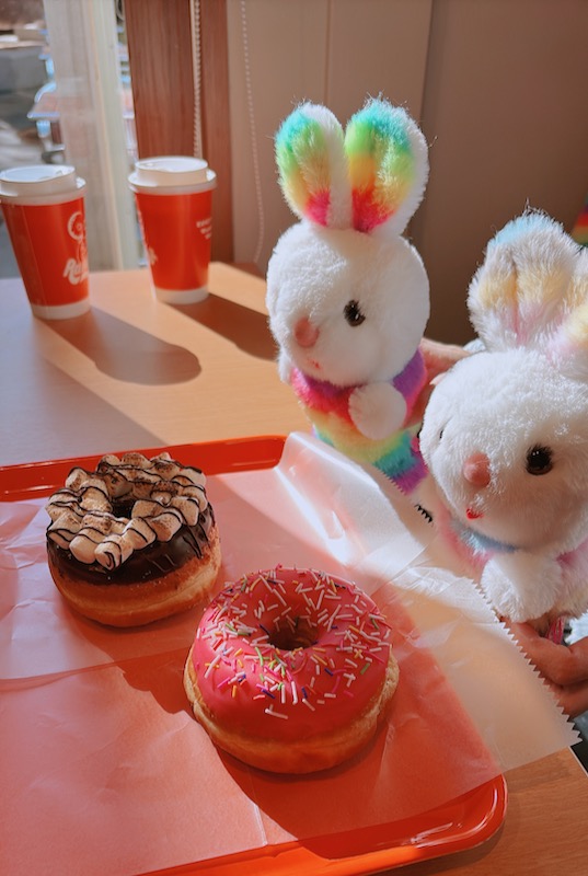 Randy’s Donutsへマシュマロバニーを連れて行ってきました♡選んだのはピンクレイズドスプリンクルズとマシュマロがのったスモアズレイズド。店内は甘い香りに包まれていました。Yummy!!