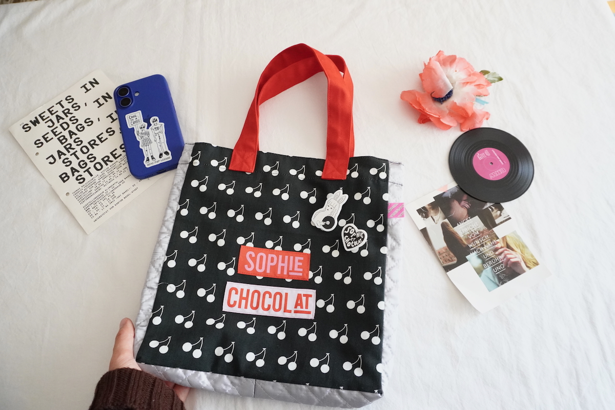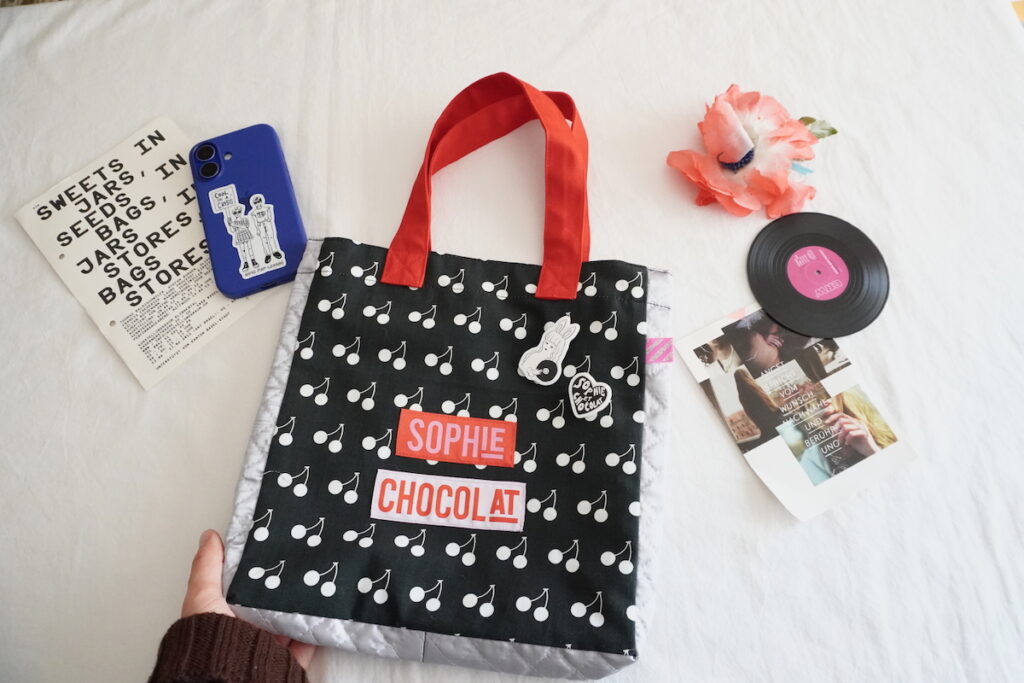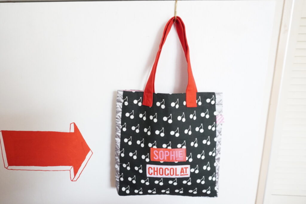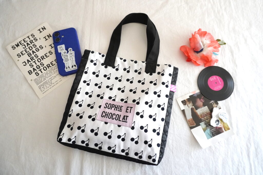 マチ部分はキルティング、持ち手はブラックコットンなので甘くなりすぎず、異なる素材を組み合わせたSophieらしいバッグですよ。