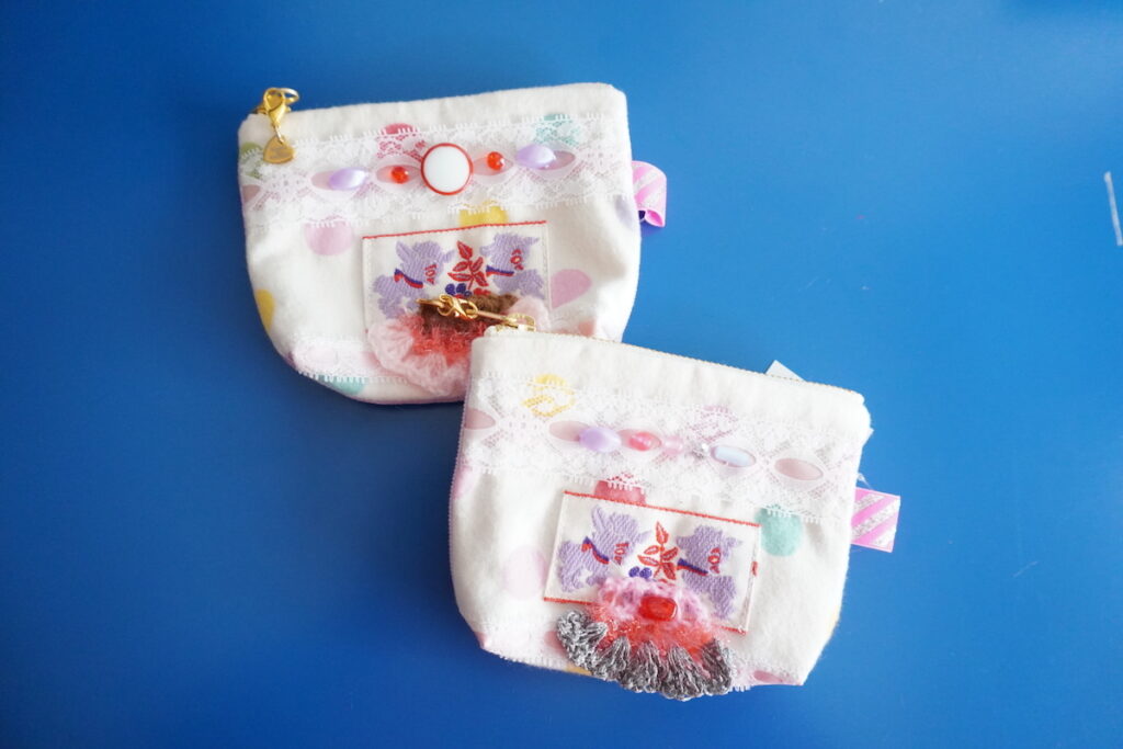 vintageの珍しいテープやビーズなどを贅沢にあしらった1点物のミニポーチ。本日夕方頃オンラインにUP予定なのでお楽しみに!