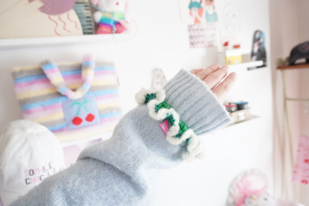 にニットシュシュのNEWカラーをアップしました♡腕に付けるとオシャレな袖に見えてSuper可愛いですよ。