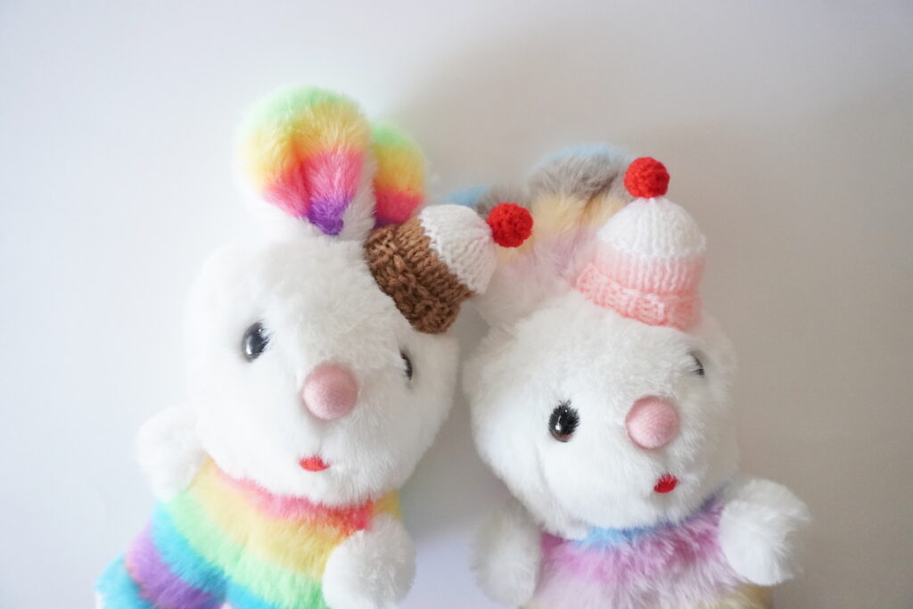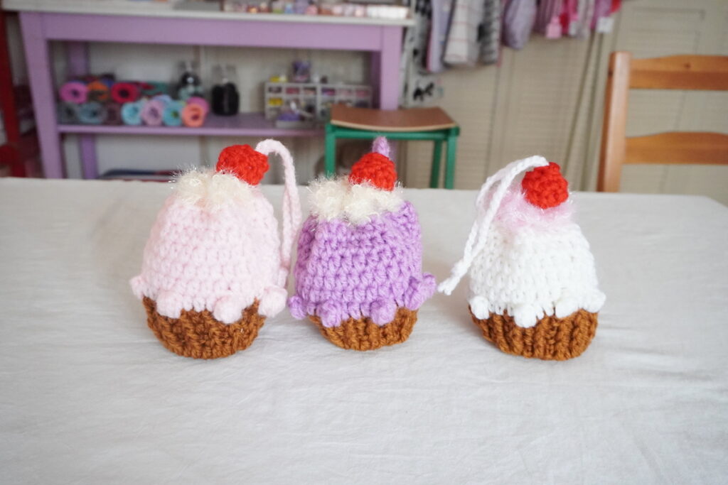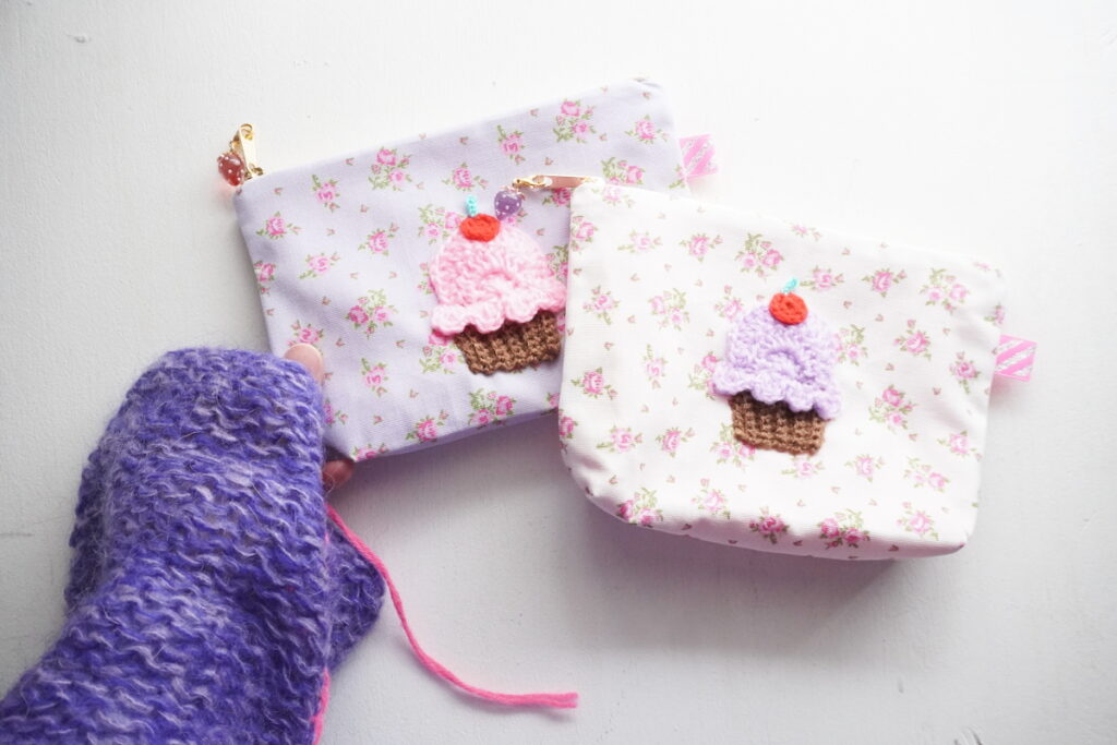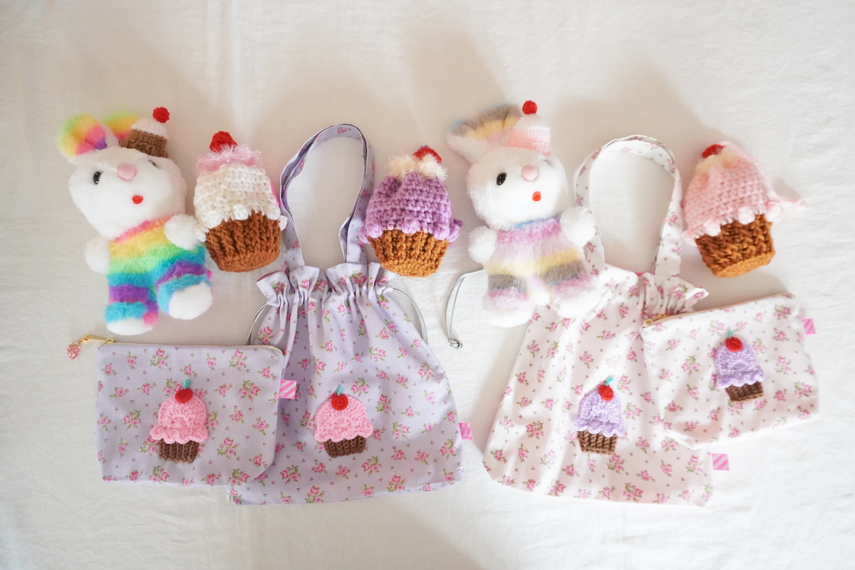 本日21:00-オンラインショップに「CUPCAKE」カテゴリーが登場します🩵ニットのミニ巾着、カップケーキワッペンシリーズ、レインボーバニーもカップケーキver.を作りましたよ♪