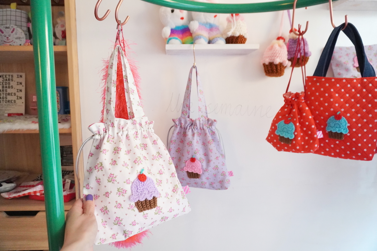 手編みのCUPCAKEワッペンがポイントの巾着BAGがこの春おすすめ!早速デザイナーも使ってます♪是非チェックしてくださいね。