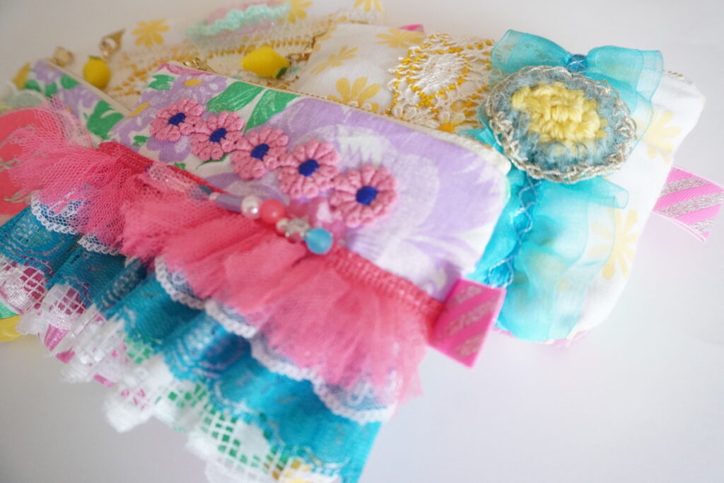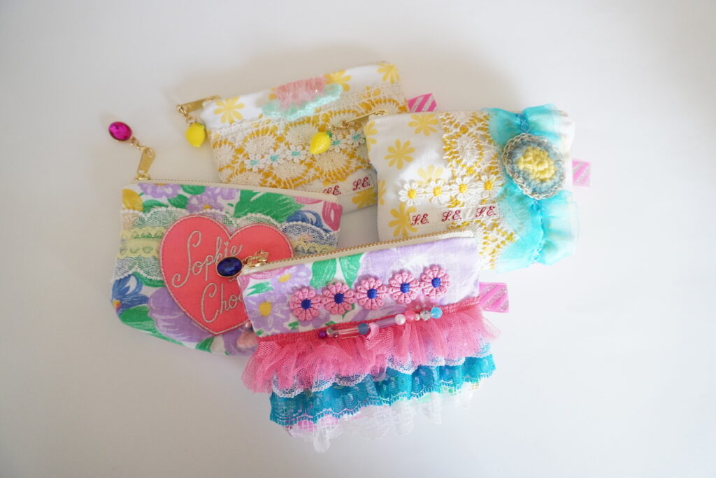 vintageの生地に、レースやワッペンなどバランスよくデザインした1点物のミニポーチ。
